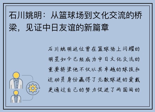 姚明作为中国篮球的标志性人物,近期对广州的篮球氛围给予了高度评价,并称其为中国篮球发展的重要城市。文章将从四个方面深入探讨这一观点:首先,广州独特的文化背景和历史积淀如何促进了篮球运动的发展;其次,广州在青少年培训体系上的优势和成就;第三,广州职业篮球联赛的活跃及其对全国篮球生态的影响;最后,姚明个人经历与广州市民热情支持之间的互动关系。这些方面不仅展示了广州在中国篮球发展中的地位,也反映出姚明对...