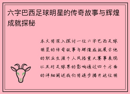 九指足球明星的传奇人生与不屈精神,是一个充满感动与启示的故事。本文将详细探讨这位足球明星如何在逆境中成长,展现出顽强毅力和卓越才能。他不仅以九根手指的独特形象赢得了广泛关注,更是在绿茵场上用实际行动证明了自己的价值。文章将从他的早期生活、职业生涯、个人挑战以及对社会的影响四个方面进行深入阐述,揭示他背后不为人知的辛酸与奋斗历程。这份传奇不仅是对个人能力的认可,更是对人类精神的不屈追求的一次深刻诠释...